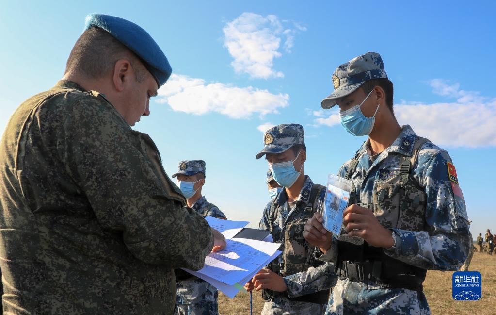 8月23日,在俄羅斯梁贊州日多瓦空降場,參加“空降排”空降兵分隊比賽的中國參賽隊隊員進行賽前身份檢錄。新華社發(方超 攝)