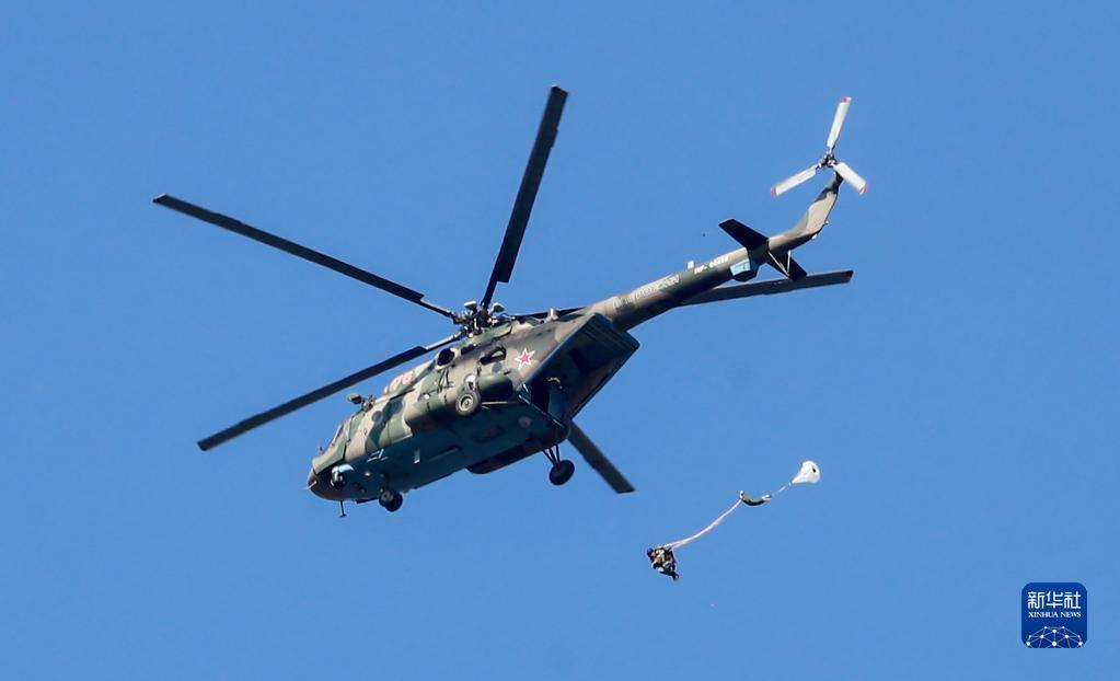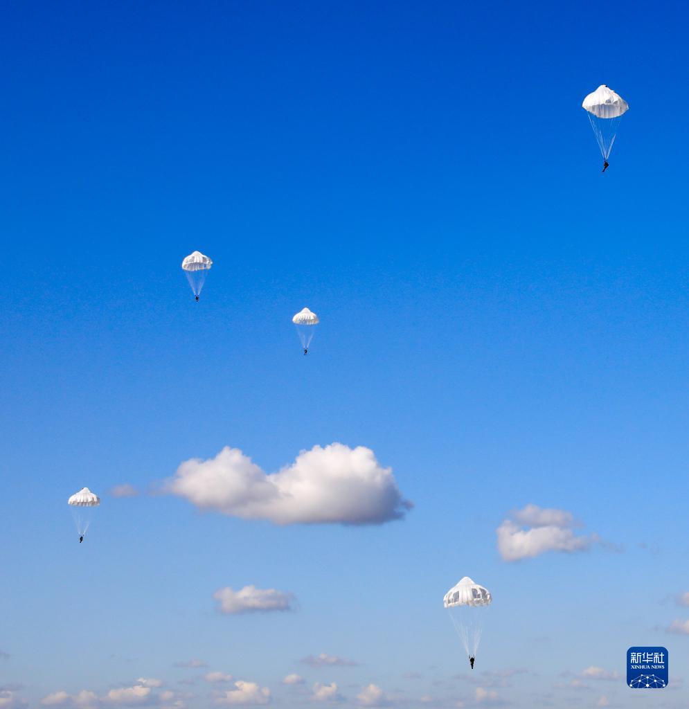 8月23日,參加“空降排”空降兵分隊比賽的各參賽隊隊員在俄羅斯梁贊州跳傘。新華社發(方超 攝)
