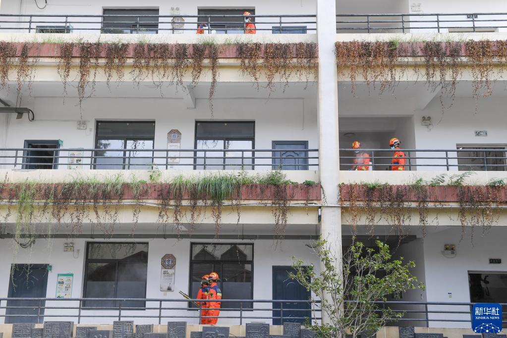 8月28日,福州市消防救援支隊鼓樓大隊消防人員在福州烏山小學開展消殺工作。