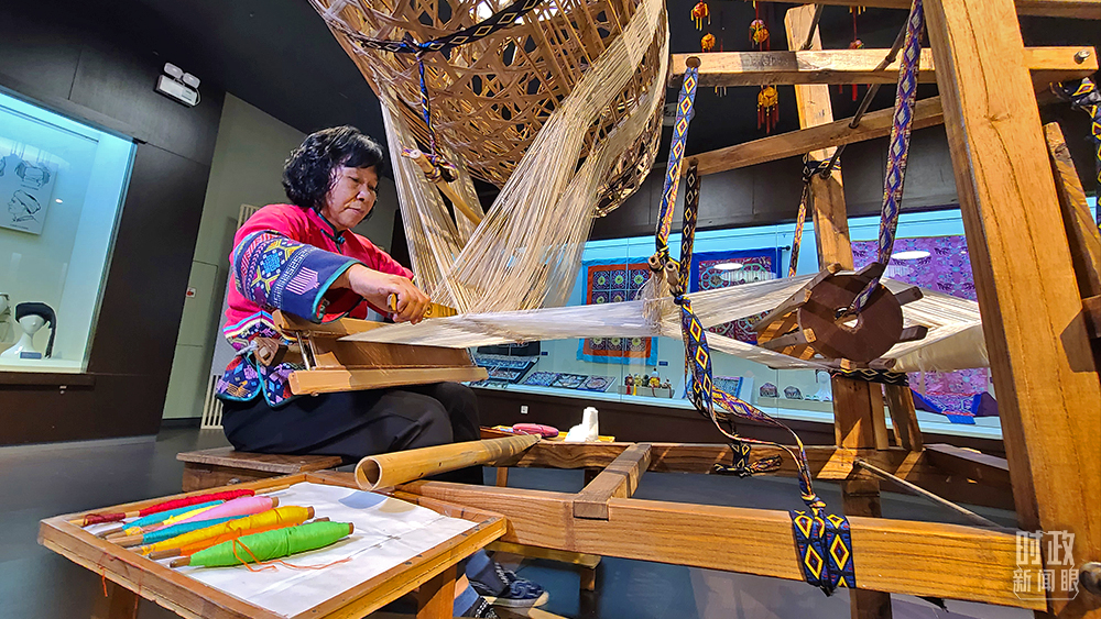 △壯錦是國家級非遺,以結實耐用、圖案別致著稱。66歲的譚湘光是廣西壯錦技藝傳承人。(總臺央視記者趙化拍攝)