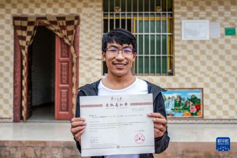寧蒗寧海民族中學(xué)第三屆“海安班”學(xué)生蘇文杰展示不久前收到的復(fù)旦大學(xué)錄取通知書(8月25日攝)。新華社記者 胡超 攝