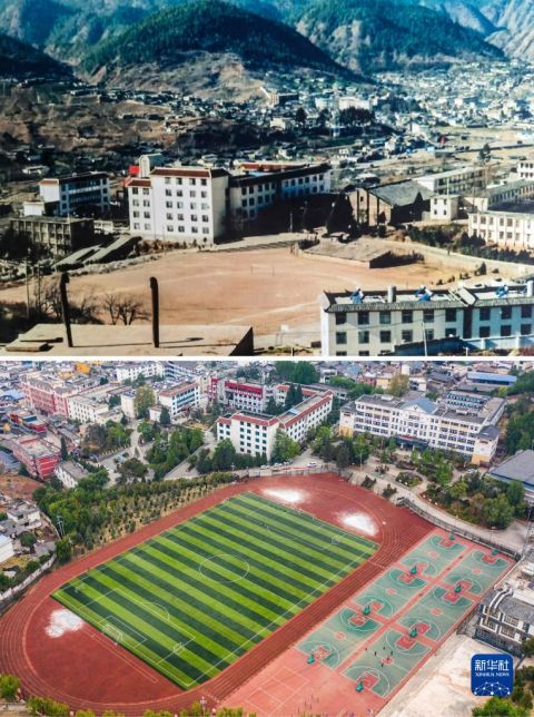 拼版照片,上圖為:20世紀(jì)90年代的寧蒗寧海民族中學(xué)一景(資料照片);下圖為:2021年4月16日拍攝的寧蒗寧海民族中學(xué)一景(無人機照片,新華社記者胡超攝)新華社發(fā)