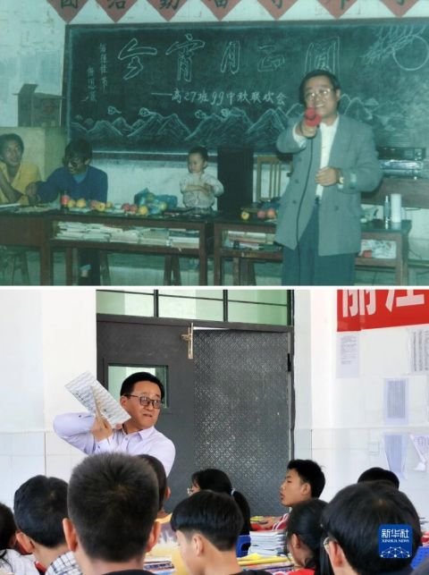 拼版照片,上圖為:海安老師王霖伯在寧蒗寧海民族中學(xué)高27班教室過中秋節(jié)(資料照片,1999年9月攝);下圖為:海安老師王霖伯在寧蒗二中高103教室上課(2021年4月23日攝,新華社發(fā))新華社發(fā)