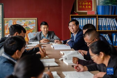 在寧蒗寧海民族中學(xué),海安老師王擁軍(右四)作為化學(xué)備課組組長和同事一起備課(8月26日攝)。新華社記者 胡超 攝