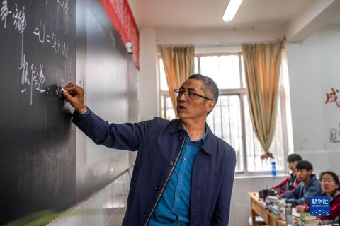 寧蒗寧海民族中學(xué)海安4班的班主任謝友軍在教室里上課(4月16日攝)。新華社記者 胡超 攝
