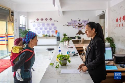 在寧蒗縣幸福家園易地扶貧搬遷安置區(qū),搬遷戶蘇解放莫向紫瑪街道黨工委副書記盧云花(右)咨詢就業(yè)補助事項(8月25日攝)。新華社記者 胡超 攝