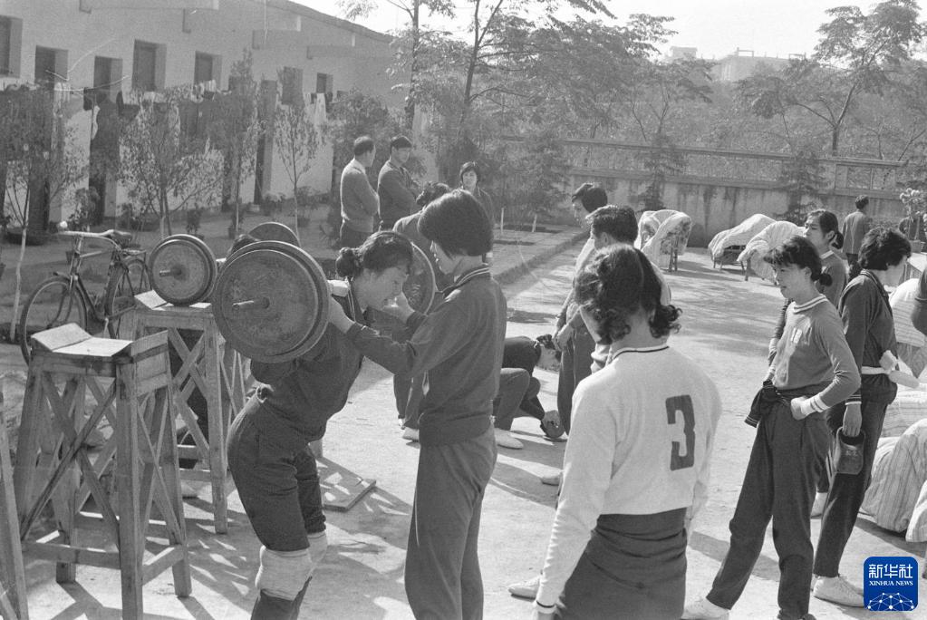 即將前往香港參加第二屆亞洲女子排球錦標賽的中國女子排球隊,正在抓緊進行賽前準備。圖中進行身體力量訓練的是主力隊員楊希,在旁邊協助的是郎平(1979年11月29日發) 。新華社發(蘇汝昌 攝)