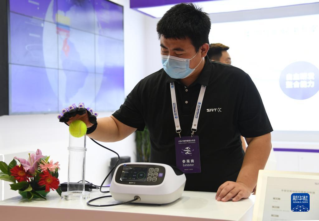 9月10日,工作人員在2021世界機(jī)器人博覽會(huì)現(xiàn)場展示手部主被動(dòng)運(yùn)動(dòng)康復(fù)訓(xùn)練器。