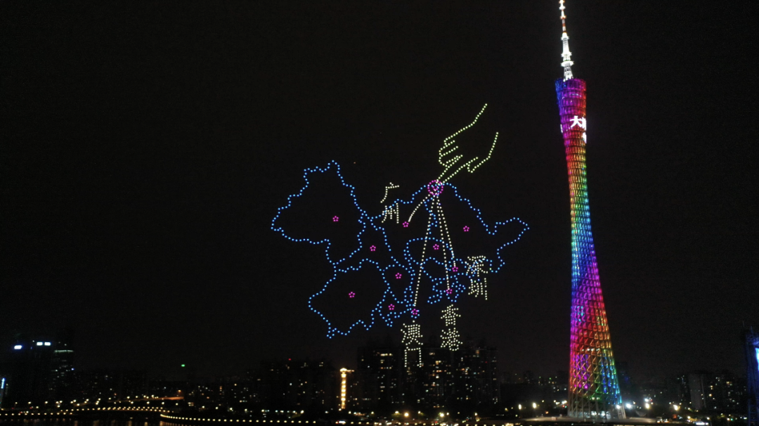 △一千架無(wú)人機(jī)劃破夜空,在廣州的天幕上組成“大灣區(qū)大未來(lái)”的字樣,隨后又以精確的定位擺出粵港澳大灣區(qū)地圖。
