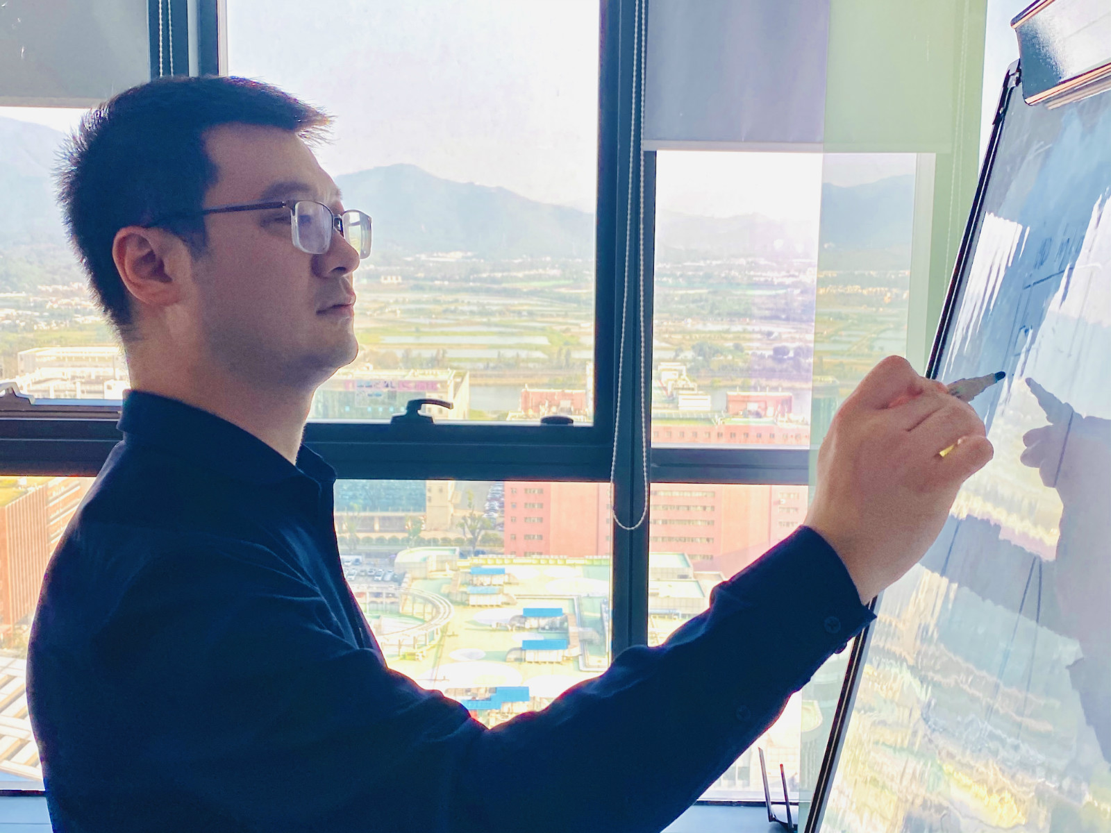 △廣東省深圳市前海世貿(mào)大廈,年輕人在一家創(chuàng)業(yè)企業(yè)中工作,窗外正是前海深港合作區(qū)。