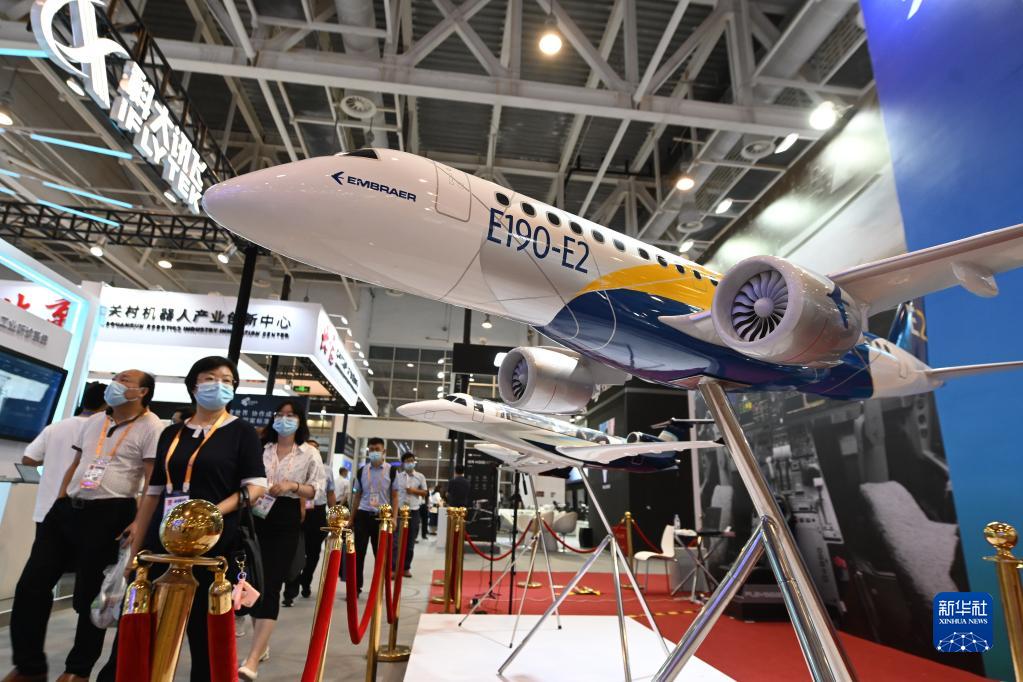 這是2021金磚國家新工業革命展巴西航空工業公司展位展出的飛機模型(9月8日攝)。新華社記者 林善傳 攝