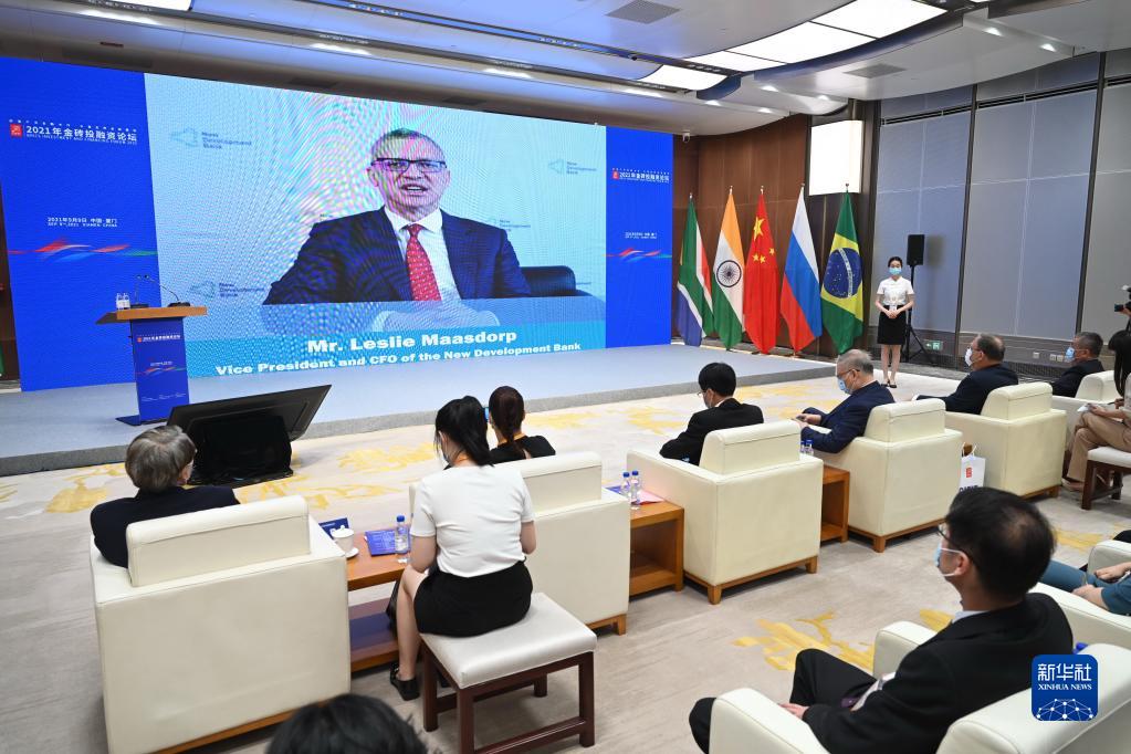 9月9日,金磚國家新開發銀行副行長兼首席財務官馬磊立在2021年金磚投融資論壇上通過視頻發言。新華社記者 林善傳 攝