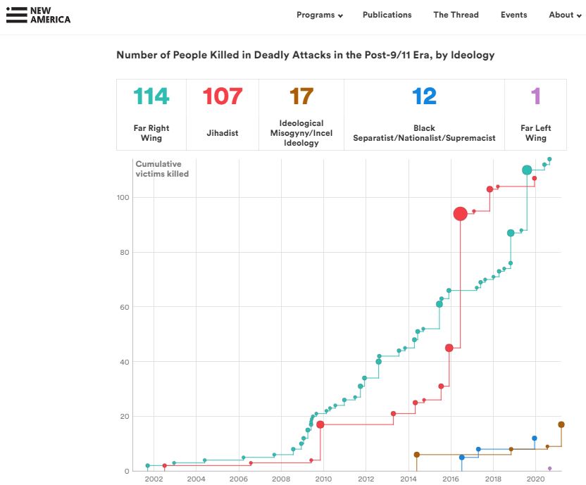 華盛頓智庫“新美國”的報告指出,2002年至2020年,美國共有107人死于所謂“圣戰”分子發動的襲擊;而美國本土的白人至上主義者、反政府民兵等極右翼恐怖分子的襲擊造成114人死亡,比“圣戰”分子制造的襲擊更致命。