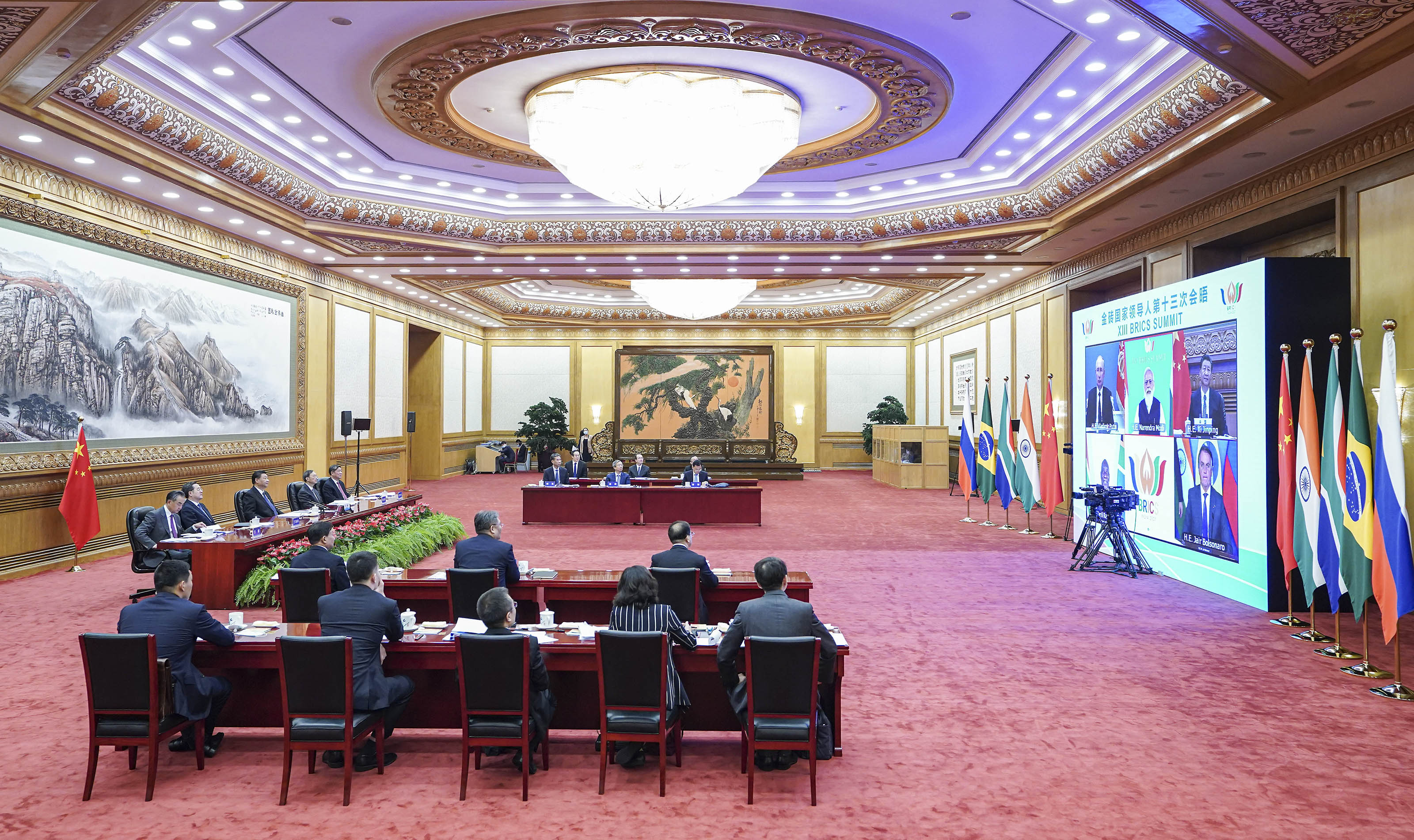 2021年9月9日晚,金磚國家領導人第十三次會晤以視頻方式舉行。國家主席習近平在北京出席會晤并發表重要講話。南非總統拉馬福薩、巴西總統博索納羅、俄羅斯總統普京出席,印度總理莫迪主持會晤。新華社記者 岳月偉 攝