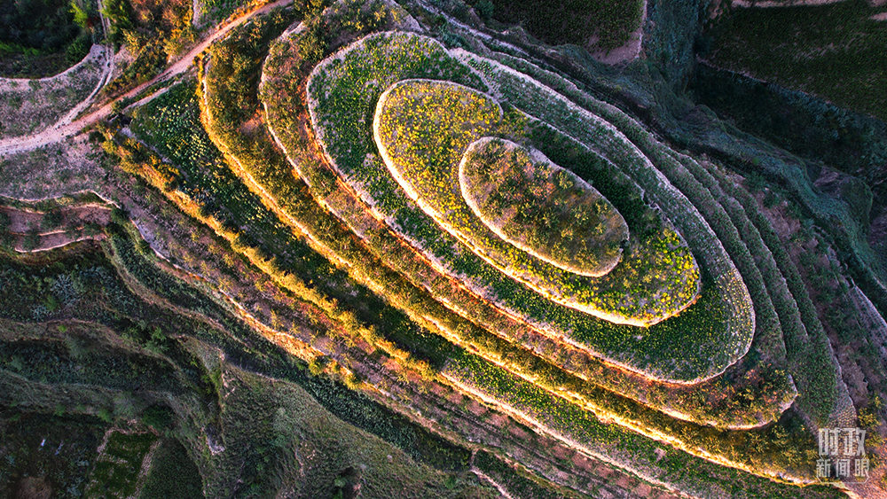 △日出時分,天光照亮高西溝村,黃色與綠色交織在一起。(總臺國廣記者李晉拍攝)