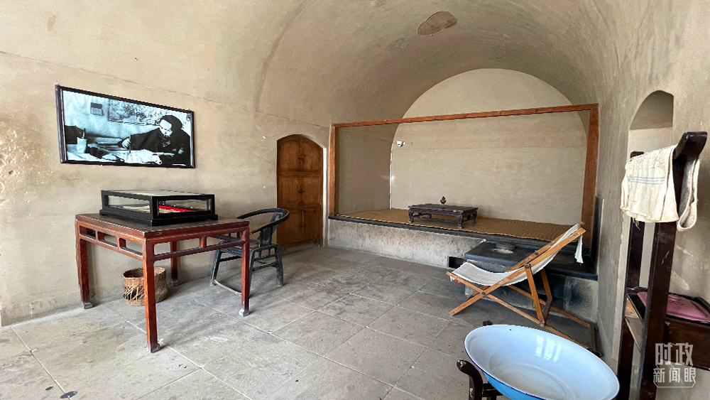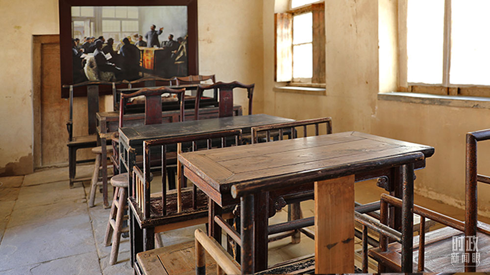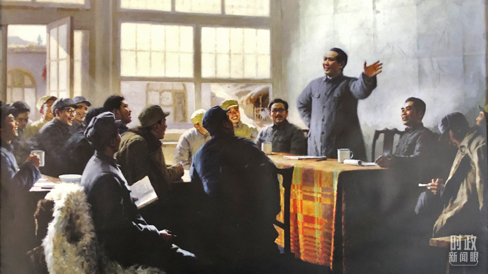 △“十二月會議”場景還原,墻壁上的照片翻拍自畫家靳尚誼于1977年創(chuàng)作的布上油畫《黨的十二月會議》。(總臺央廣記者劉會民、央視記者許永松拍攝)