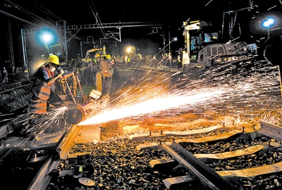 不久前,施工人員正在安九高鐵廬山站對武九客專正線進(jìn)行回?fù)苁┕ぁ?br /> 胡國林?jǐn)z(影像中國)
