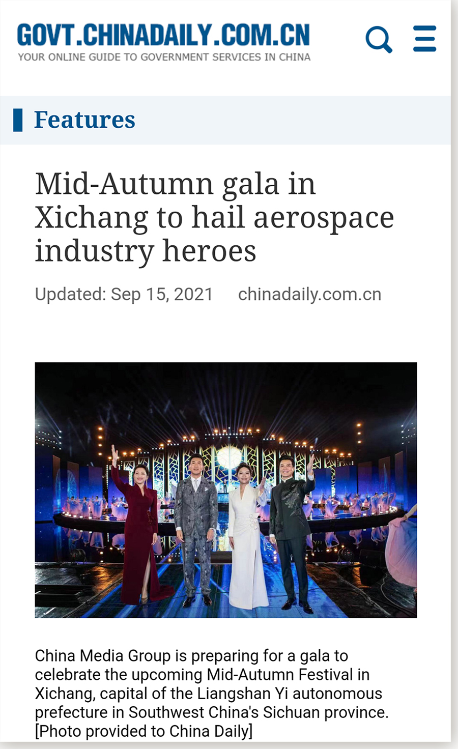 《中國(guó)日?qǐng)?bào)》刊發(fā)英文報(bào)道《Mid-Autumn gala in Xichang to hail aerospace industry heroes》,對(duì)晚會(huì)選址、舞美、節(jié)目等方面體現(xiàn)出的“秋晚品質(zhì)”加以肯定。報(bào)道評(píng)價(jià)道:“從目前公開(kāi)的內(nèi)容來(lái)看,無(wú)論是與晚會(huì)契合度極高的巧妙選址,還是科技與藝術(shù)效果交融,古今結(jié)合的舞美效果,以及精心雕琢傳遞多重關(guān)懷的節(jié)目編排,都體現(xiàn)了今年秋晚的品質(zhì)與匠心”。《時(shí)代論壇報(bào)》刊發(fā)題為《2021中秋晚會(huì):匠心雕琢 娓娓道來(lái)中秋的故事》的文章,也著重報(bào)道了晚會(huì)的匠心之筆。