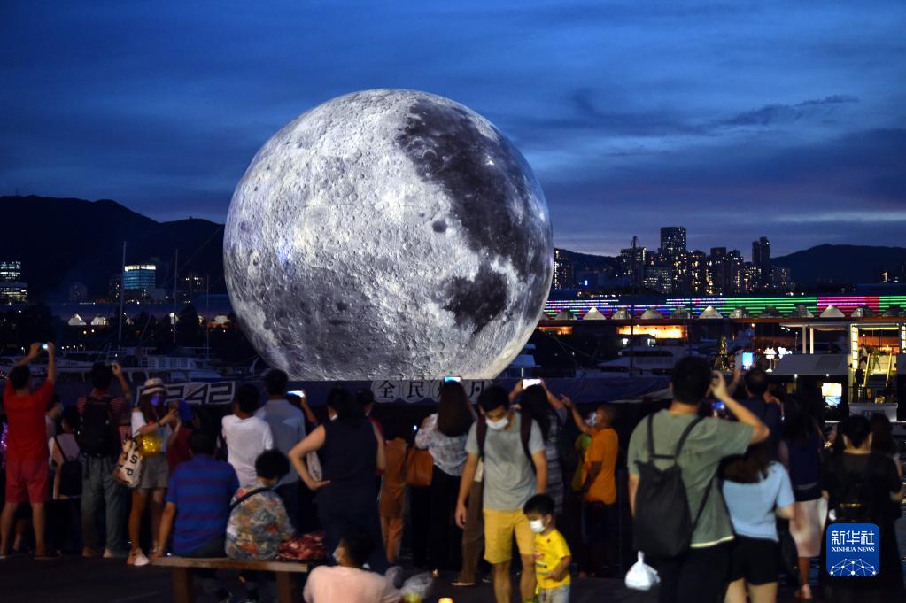 當日, 香港觀塘海濱長廊旁裝置了高達15米的巨型發光“月亮”,吸引不少市民前來觀看。新華社記者 盧炳輝 攝