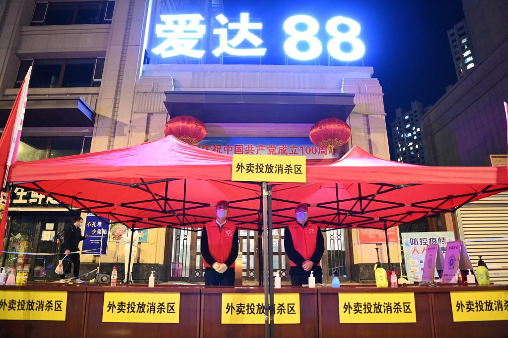 愛達88小區是目前哈爾濱市主城區中唯一的中風險地區。記者在這里看到,社區門前拉有警戒線,門外劃定了外賣投放消殺區和專用人員通道,社區工作人員和志愿者穿著厚厚的衣服在站崗。