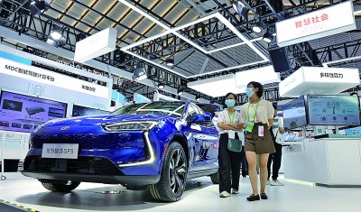 觀眾在2021年“互聯網之光”博覽會華為展臺上參觀電動汽車。光明網記者 季春紅攝/光明圖片