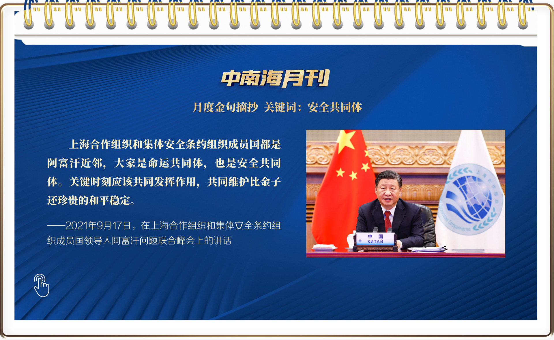 高頻詞中,“安全”一詞也位于前列。9月17日,習近平主席在北京以視頻方式出席上海合作組織和集體安全條約組織成員國領導人阿富汗問題聯合峰會。習主席在峰會上以生動比喻對安全問題表明立場:上海合作組織和集體安全條約組織成員國都是阿富汗近鄰,大家是命運共同體,也是安全共同體。關鍵時刻應該共同發揮作用,共同維護比金子還珍貴的和平穩定。