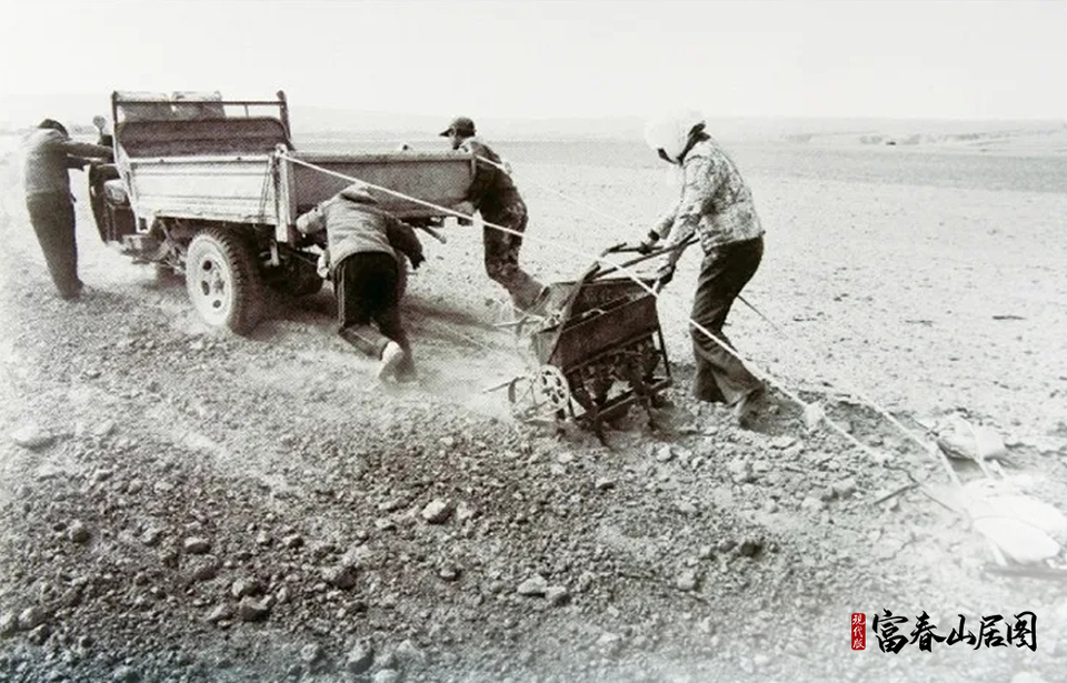 寧夏回族自治區銀川市永寧縣閩寧鎮建設初期,移民群眾在戈壁灘上開荒種田。