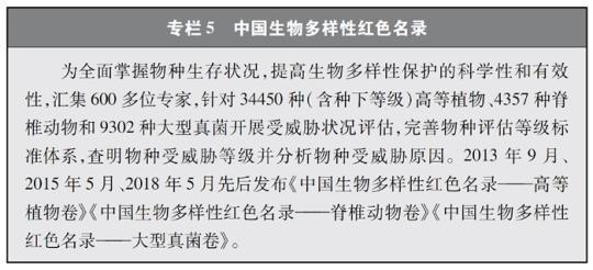 開展全國生物多樣性調查與評估。大力推進生物多樣性保護重大工程實施,結合自然資源調查、生態(tài)系統(tǒng)監(jiān)測評估等工作,不斷完善生物多樣性調查與評估能力,首次將生物多樣性指標納入生態(tài)質量綜合評價指標體系,引導地方加強生態(tài)文明建設與生物多樣性保護。開展自然資源調查,包括森林、草原、水、濕地、荒漠、海洋等,建立自然資源調查評價監(jiān)測制度。構建了涵蓋2376個縣級行政單元、樣線總長超過3.4萬公里的物種分布數據庫,建立物種資源調查及收集信息平臺,準確反映野生動植物空間分布狀況。完成長江經濟帶、京津冀等國家戰(zhàn)略區(qū)域180多個縣級行政區(qū)生物多樣性調查與評估。組織開展近海漁業(yè)資源調查,初步掌握近海漁業(yè)資源狀況。陸續(xù)發(fā)布《中國植物紅皮書》《中國瀕危動物紅皮書》《中國物種紅色名錄》《中國生物多樣性紅色名錄》,基本掌握生物多樣性總體情況,為加強生物多樣性保護奠定了科學基礎。
