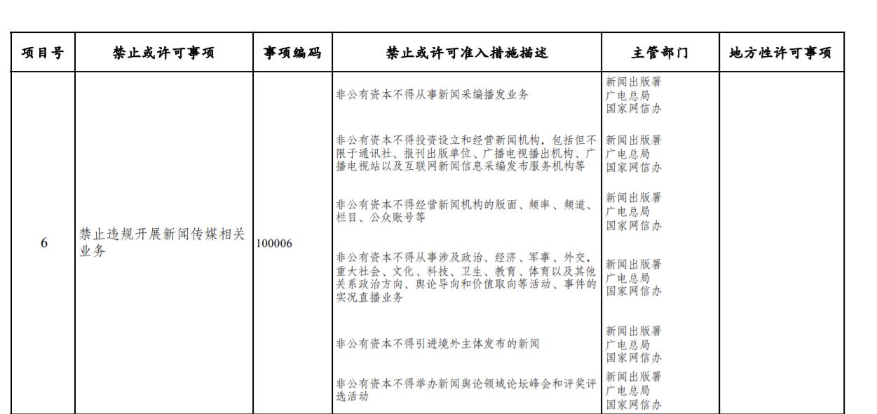 2、非公有資本不得投資設立和經營新聞機構,包括但不限于通訊社、報刊出版單位、廣播電視播出機構、廣播電視站以及互聯網新聞信息采編發布服務機構等。
