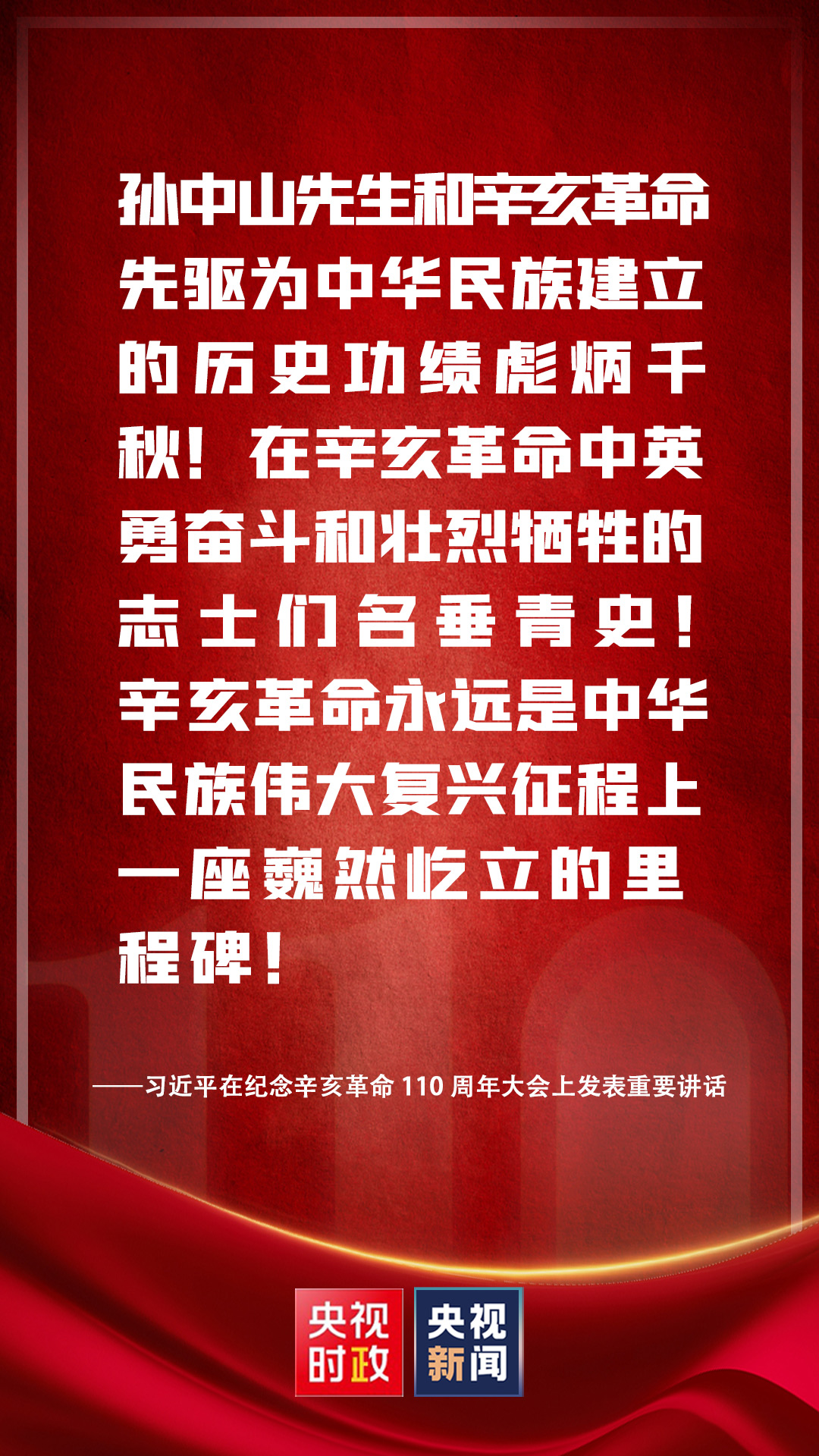 紀(jì)念辛亥革命110周年大會(huì)于10月9日上午10時(shí)在北京人民大會(huì)堂隆重舉行。中共中央總書(shū)記、國(guó)家主席、中央軍委主席習(xí)近平出席大會(huì)并發(fā)表重要講話。