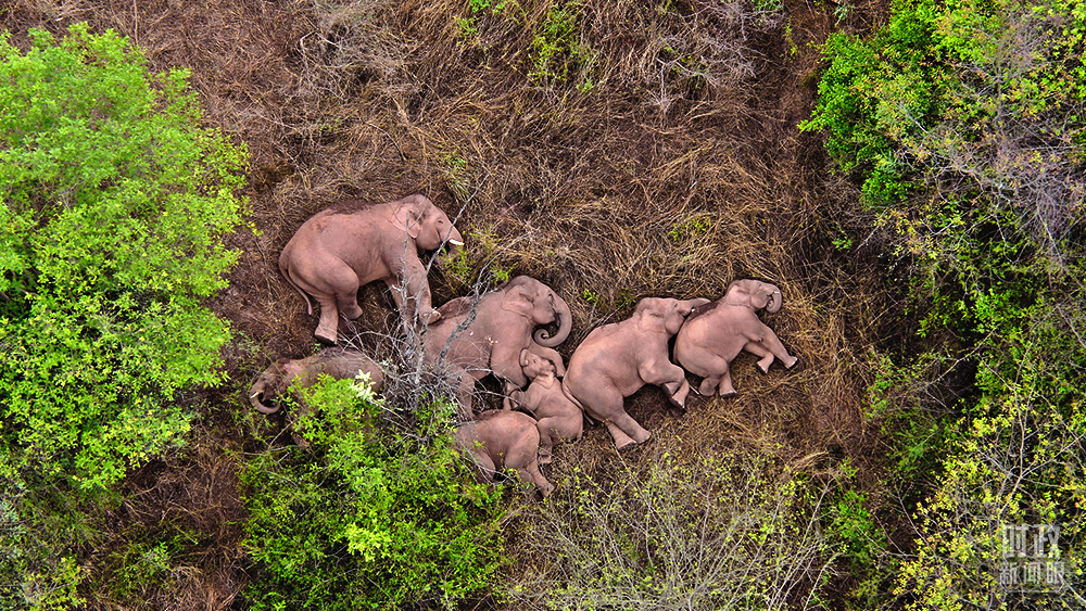 △2021年6月7日,云南省森林消防總隊的無人機監測人員觀測到野象群暫停遷徙的一幕。這是監測野象12天來,第一次發現象群集體躺著睡覺。(圖/視覺中國)