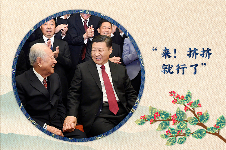 總書記拉著他們的手,請兩位老人坐到自己身邊來,兩人執意推辭,總書記一再邀請:“來!擠擠就行了,就這樣。”自然而然的舉動,正是總書記尊老敬賢的真情流露。