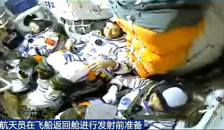 3名航天員陸續通過飛船軌道艙進入返回艙。