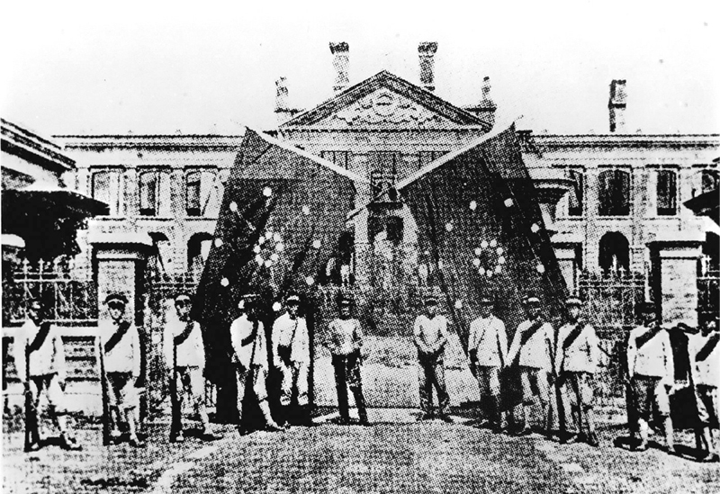 武昌起義勝利后,各省紛紛響應(yīng),宣布獨立。圖為革命軍占領(lǐng)武昌城后,軍政府掛起象征十八省團結(jié)一致的十八星軍旗(資料照片)。 新華社發(fā)