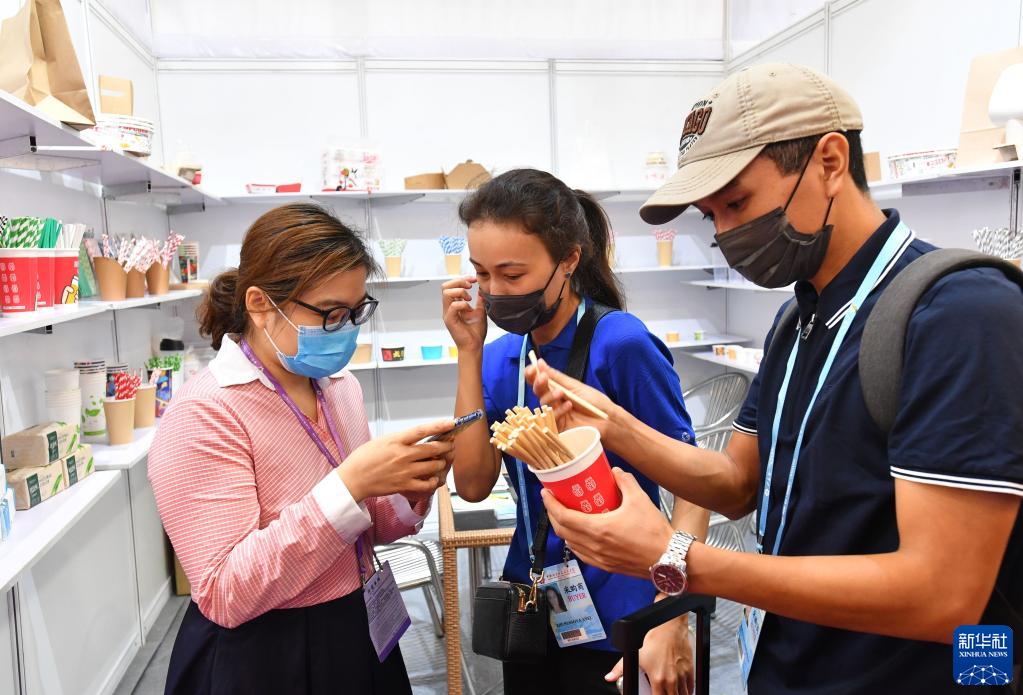 10月15日,在第130屆廣交會上,來自哈薩克斯坦的采購商在和一家環保餐具參展商(左)洽談。新華社記者 劉大偉 攝
