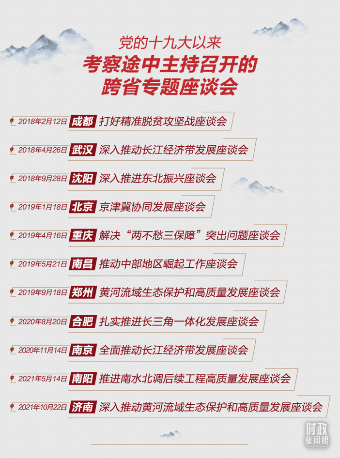 《時政新聞眼》梳理發(fā)現(xiàn),加上這次座談會,黨的十九大以來,習(xí)近平總書記在考察途中一共主持召開了11場跨省座談會。除了3場聚焦脫貧攻堅、南水北調(diào)外,其他8場關(guān)注的都是區(qū)域協(xié)調(diào)發(fā)展的重大戰(zhàn)略和部署。