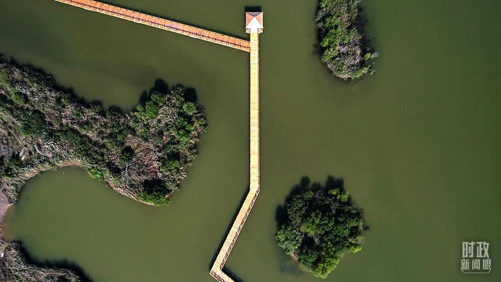 △黃河三角洲,延伸到水中的木質(zhì)棧道。(總臺國廣記者李晉拍攝)