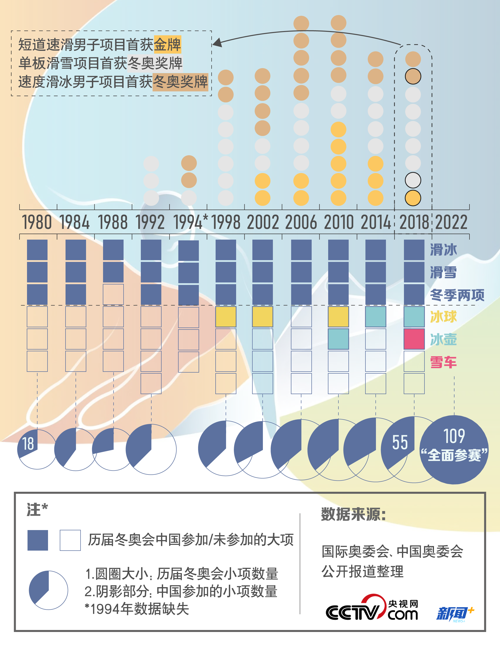 北京獲得冬奧會舉辦權前,中國代表團在歷屆冬奧會上參賽的大項(Sport)僅占所有大項種類的半數左右,除了滑冰、滑雪和冬季兩項等“常規”項目外,其他項目中零星可見中國運動員的身影。也就是說,許多冬季項目在中國仍然是空白——據統計,在北京冬奧會109個小項(Event)中,大約有三分之一此前并未開展。短短幾年間,中國競技冰雪運動惡補短板,力爭在2022年冬奧會上,從頭至尾都有帶有五星紅旗標志的中國運動員站在賽場上,實現“全面參賽”目標。
