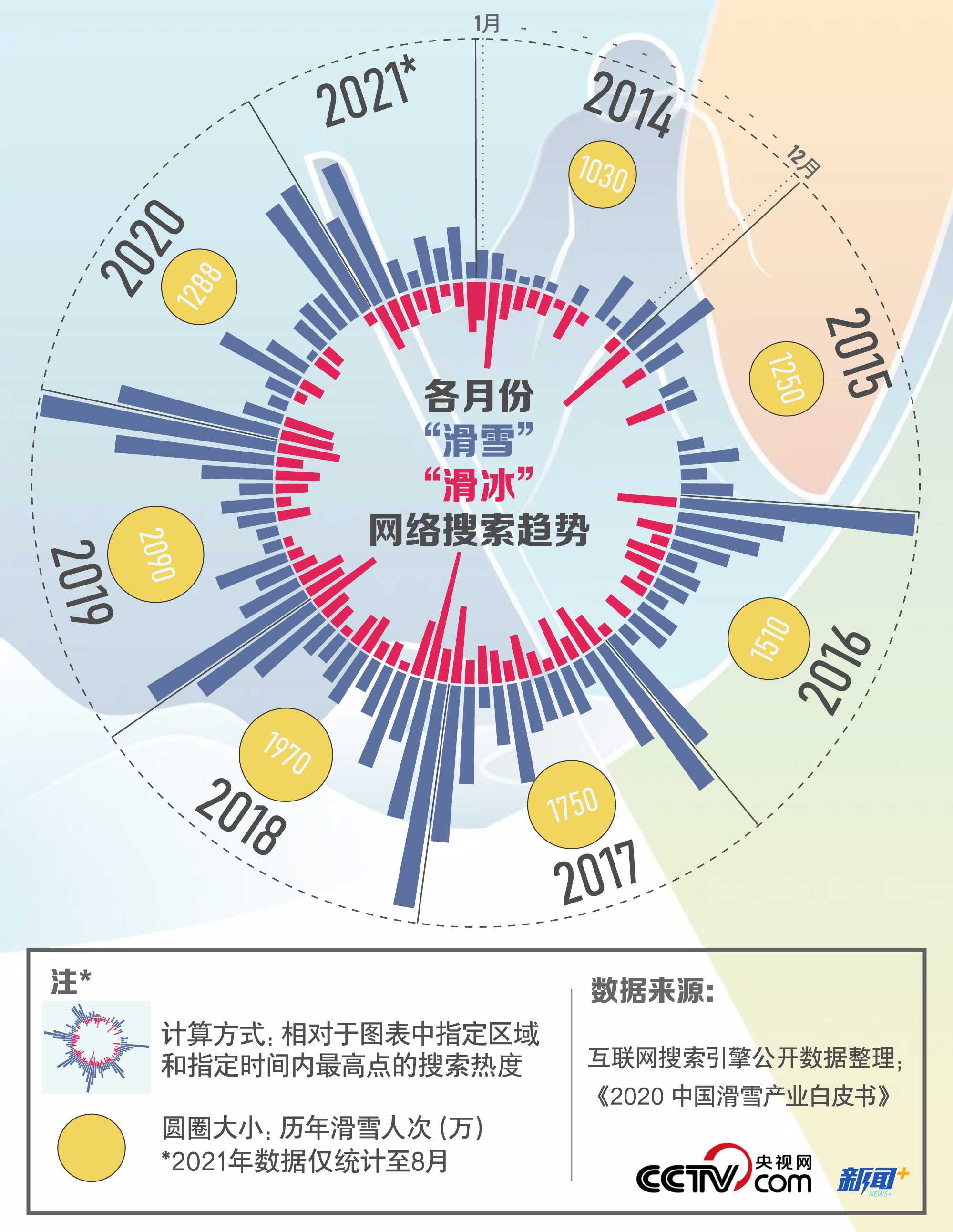 據央視網統計,自2016年起,公眾在互聯網搜索“滑雪”“滑冰”等冰雪項目的頻次明顯上升,且多集中在11月、12月和次年1月。除2020年受疫情防控的影響外,實際參與滑雪項目的群眾也逐年增多,2019年參與滑雪運動的人次是2014年的二倍。