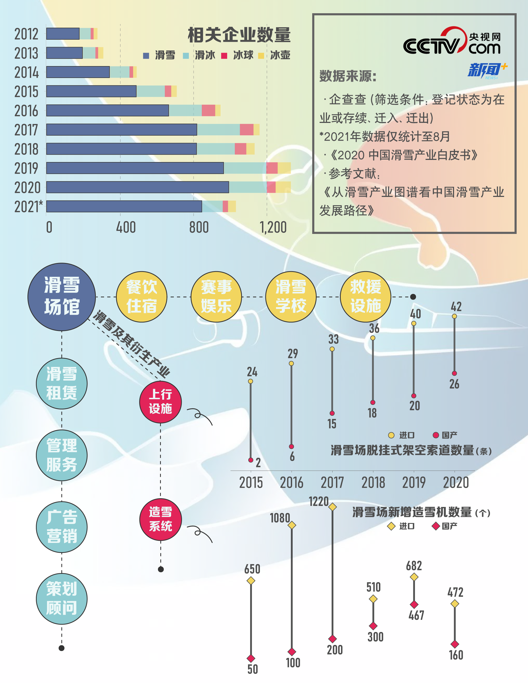 大眾對于冰雪運動的衍生需求給冰雪產業的發展奠定了一定基礎。近幾年,中國冰雪產業蓬勃發展,相關企業數量呈明顯上升趨勢,2020年僅“滑雪”類企業數量就超過2016年四類冰雪企業數量總和。同時,我國冰雪產業規模擴大、覆蓋范圍也變廣,國產品牌逐漸“嶄露頭角”。比如國產脫掛式架空索道的發展勢頭迅猛,從2015年僅有個位數增長到2020年的26條,此外國產造雪機也正代替進口商品被雪場經營方使用。由此可見,人們對于冰雪的喜愛不僅表現在“直接參與”,還間接推動了衍生產業的發展。