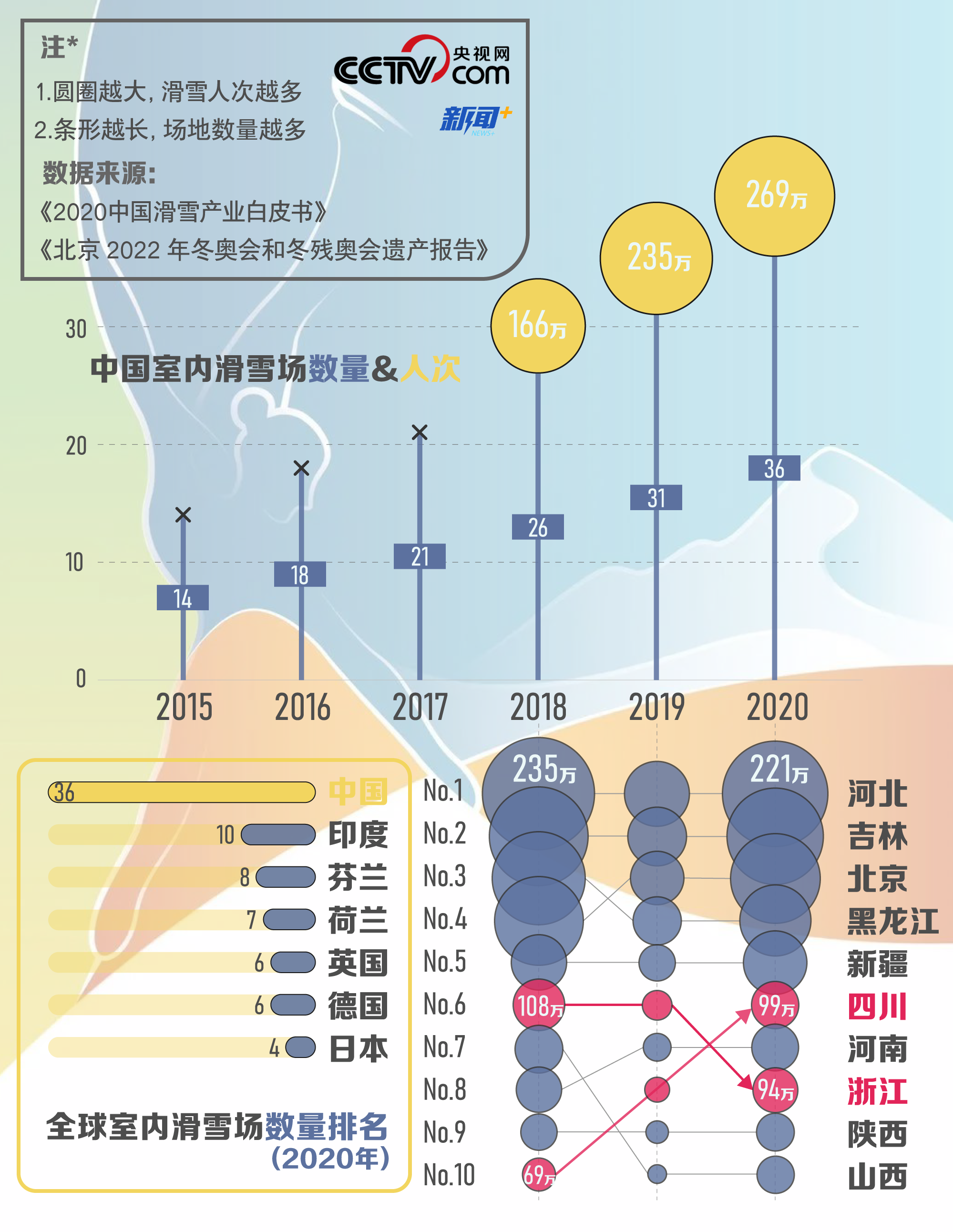 盡管與國際上眾多滑雪產業發達國家相比,中國戶外雪場的整體規模還存在不小的差距,但從室內滑雪場的發展來看,截至2020年年底,國內開業的室內滑雪場館已達36家,遙遙領先,位居榜首。