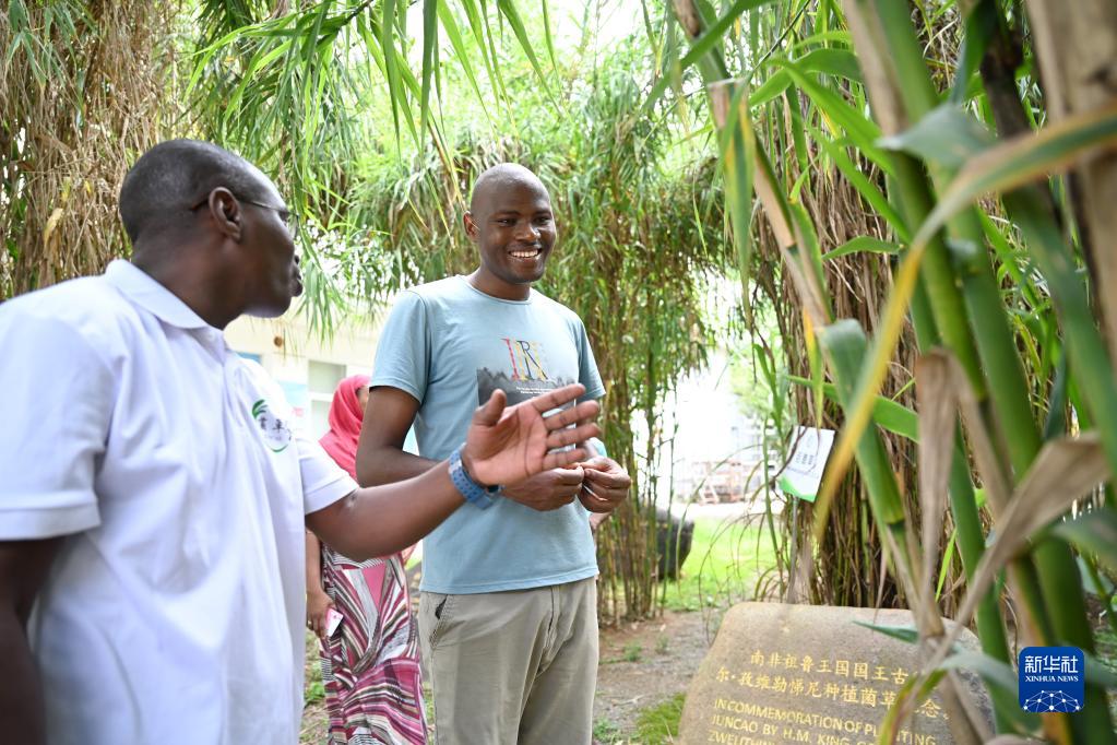 8月12日,尼日利亞留學生拉瓦迪·達蒂(左一)和肯尼亞留學生艾亞利拉·雅各布·奧卡爾在福建農林大學的“國際菌草苑”交流菌草栽培技術。新華社記者 林善傳 攝