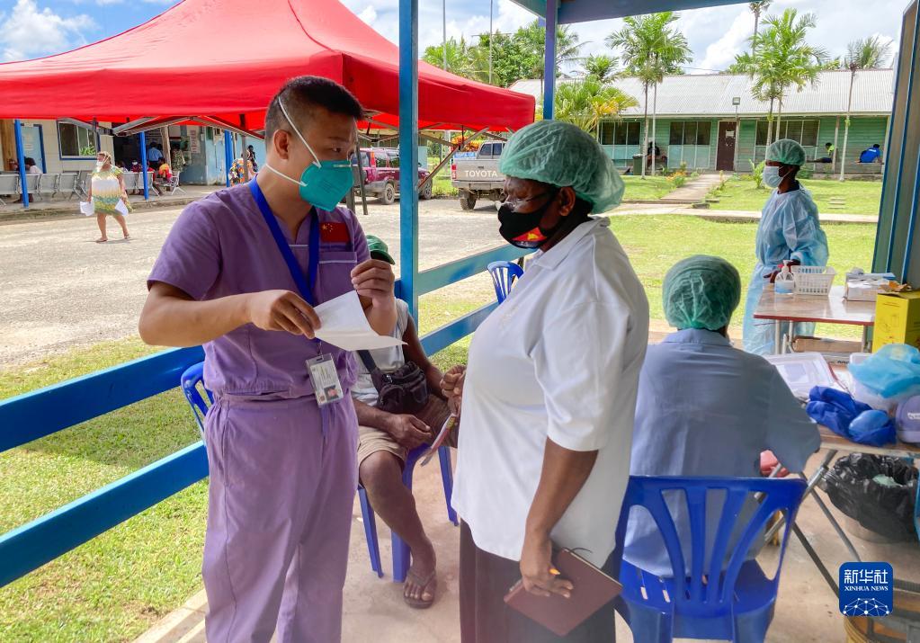 8月25日,在巴布亞新幾內亞新愛爾蘭省卡維恩總醫院,中國援巴新醫療隊隊員向當地醫護人員介紹疫苗接種注意事項。新華社發(中國援巴新醫療隊供圖)