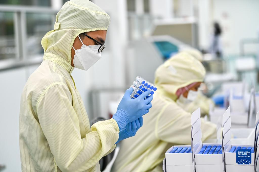 10月5日,在馬來西亞吉隆坡郊區的發馬公司灌裝工廠,一名工人在包裝本地灌裝生產的科興疫苗。新華社記者 朱煒 攝
