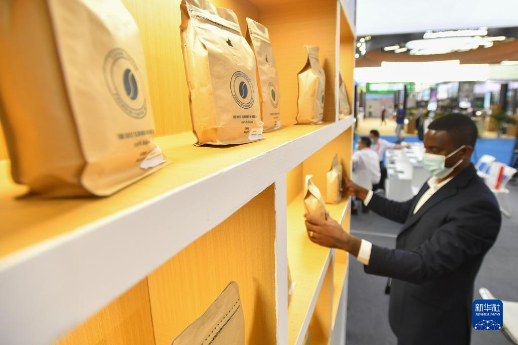 9月27日,在湖南長沙舉行的第二屆中國-非洲經貿博覽會上,參展商在整理非洲咖啡。新華社記者 陳澤國 攝