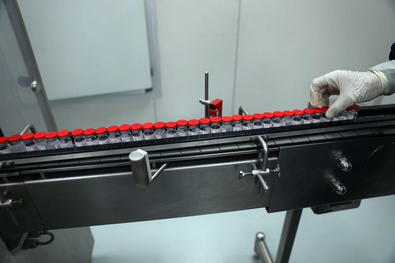 這是2021年9月6日在埃及吉薩的埃及生物制品與疫苗公司疫苗生產(chǎn)廠拍攝的疫苗生產(chǎn)線上的新冠疫苗。2021年4月21日,中國(guó)科興公司與VACSERA公司簽署在埃及生產(chǎn)科興新冠疫苗的協(xié)議。