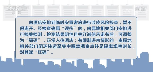 由酒店安排到臨時安置客房進行涉疫風險核查,暫不得離開。經核查確屬“誤傷”的,由屬地相關部門安排進行核酸檢測,檢測結果陰性且簽訂誠信承諾書后,可調整為“綠碼”,正常入住酒店;有限制進京情形的,由屬地相關部門閉環轉運至集中隔離觀察點補足隔離觀察時長,對其賦“紅碼”。