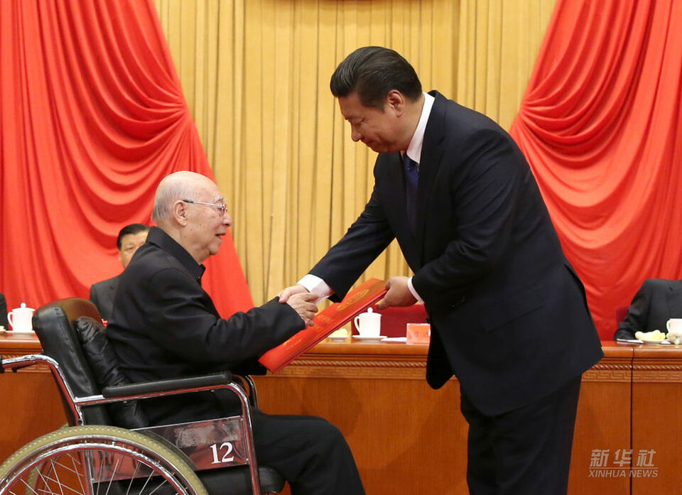 2014年度國(guó)家科學(xué)技術(shù)獎(jiǎng)勵(lì)大會(huì)上,習(xí)近平總書(shū)記彎下腰向坐在輪椅上的中國(guó)科學(xué)院院士于敏頒發(fā)2014年度國(guó)家最高科學(xué)技術(shù)獎(jiǎng)。