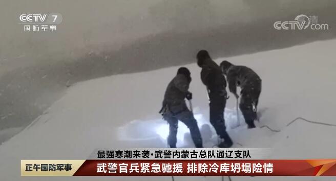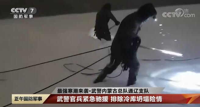 11月8日晚,內蒙古通遼一農副產品公司冷庫頂部積雪嚴重,一旦坍塌將嚴重威脅當地群眾安全。為第一時間排除險情,武警內蒙古總隊通遼支隊迅速機動至現場,官兵們用吊車拉起鋼絲繩,在冷庫棚頂清理積雪。經過官兵們連續5小時的奮戰,險情被及時排除,確保了冷庫安全,挽回經濟損失上億元。