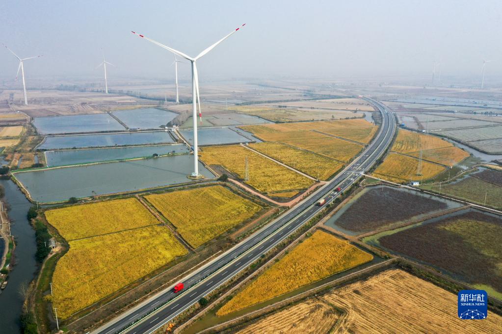 這是11月3日拍攝的江蘇省揚州市寶應縣魯垛鎮5.28萬千伏安風力發電項目(無人機照片)。新華社記者 李博 攝